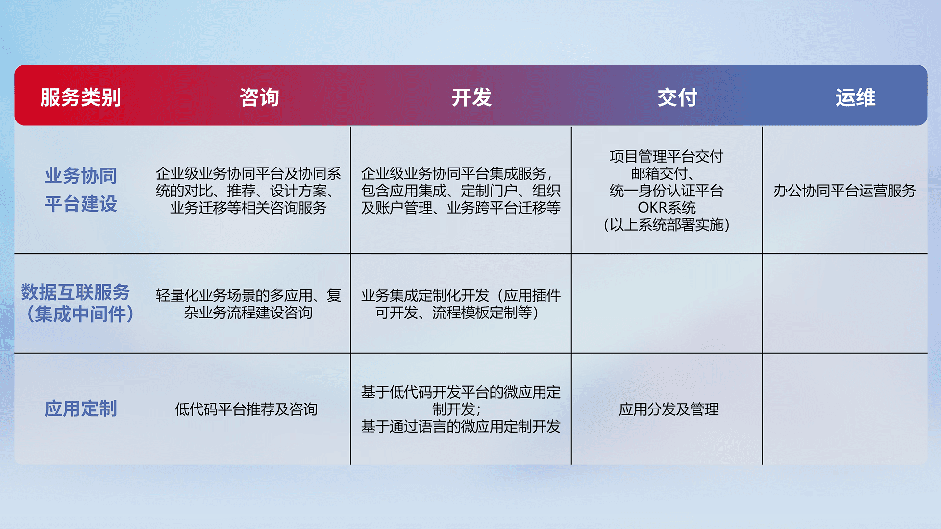 针对钉钉、、、企微、、、IDaas等平台级产品提供产品的规划、、方案、、交付、、、定制化开发等服务,,,,实现如统一协同办公、、智能客户服务、、混合会议管理、、、智能数据查询、、等业务场景,,,实现数字化转型。。。。